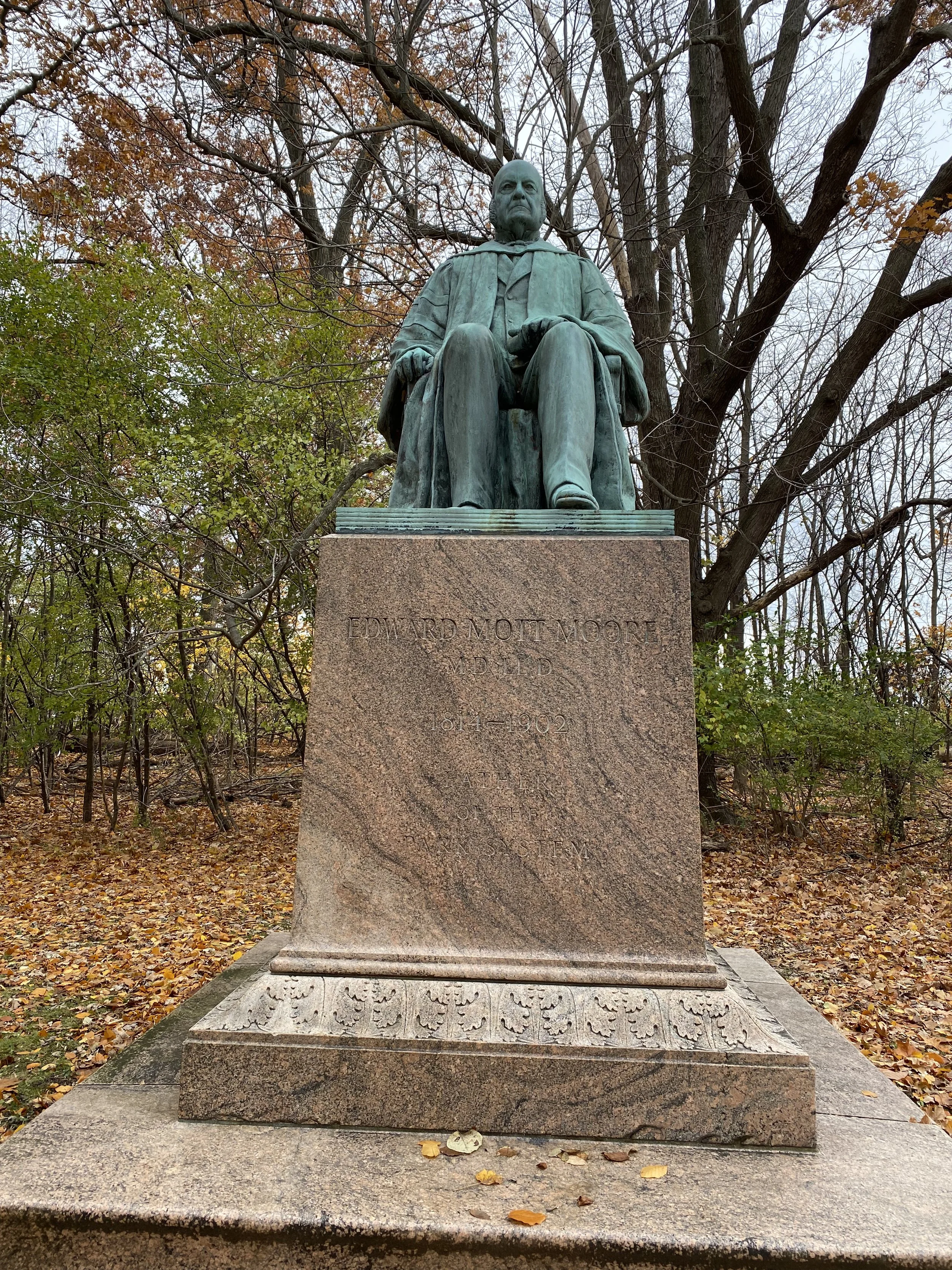 Sculpture of Edward Mott Moore, father of the Rochester Park System.